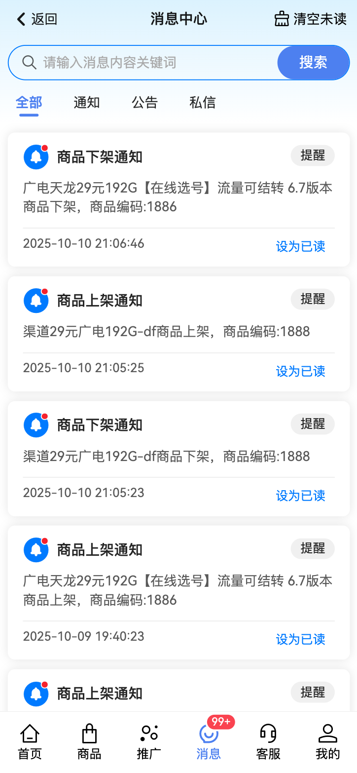 - 商品上架时,会推送全局的通知提醒,所有代理商都可以实时接收到