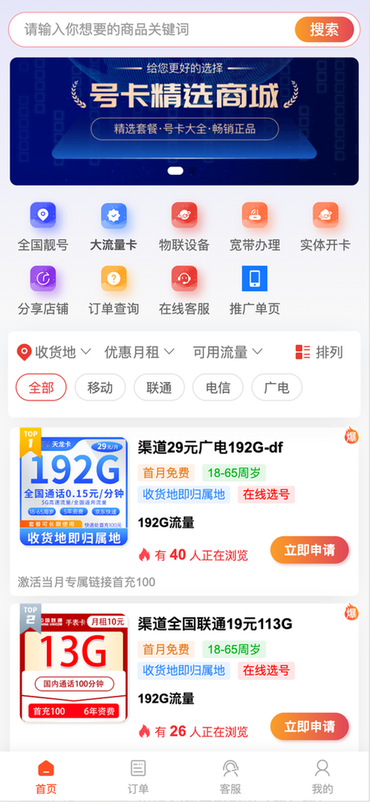 | 号卡 | 销售常规线上号卡产品,可自动化对接上下游下单、订单状态同步、结算佣金等线上操作 | 线上办理号卡新入网 |