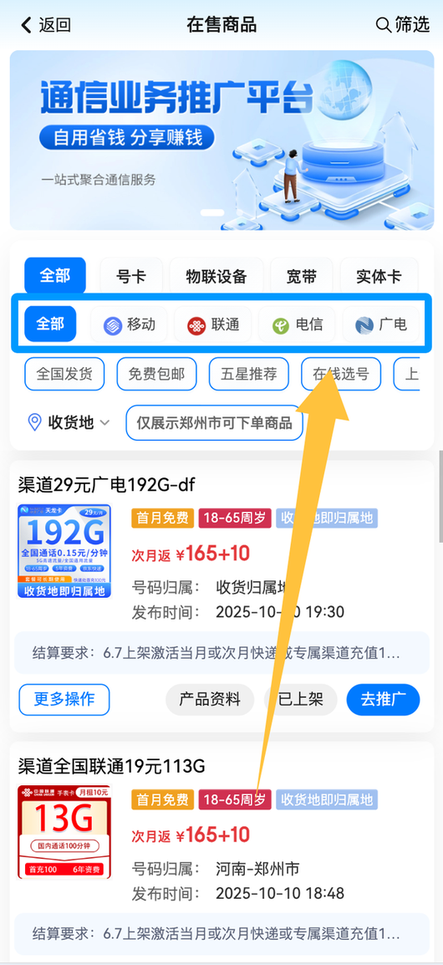 - 当添加的分类较多时,分类可以左右滑动选择。如果绑定的是四大营运商,则还会自动加载对应的营运商入网协议,该协议可通过【系统设置】→ 【配置管理】→ 【协议管理】中自定义内容