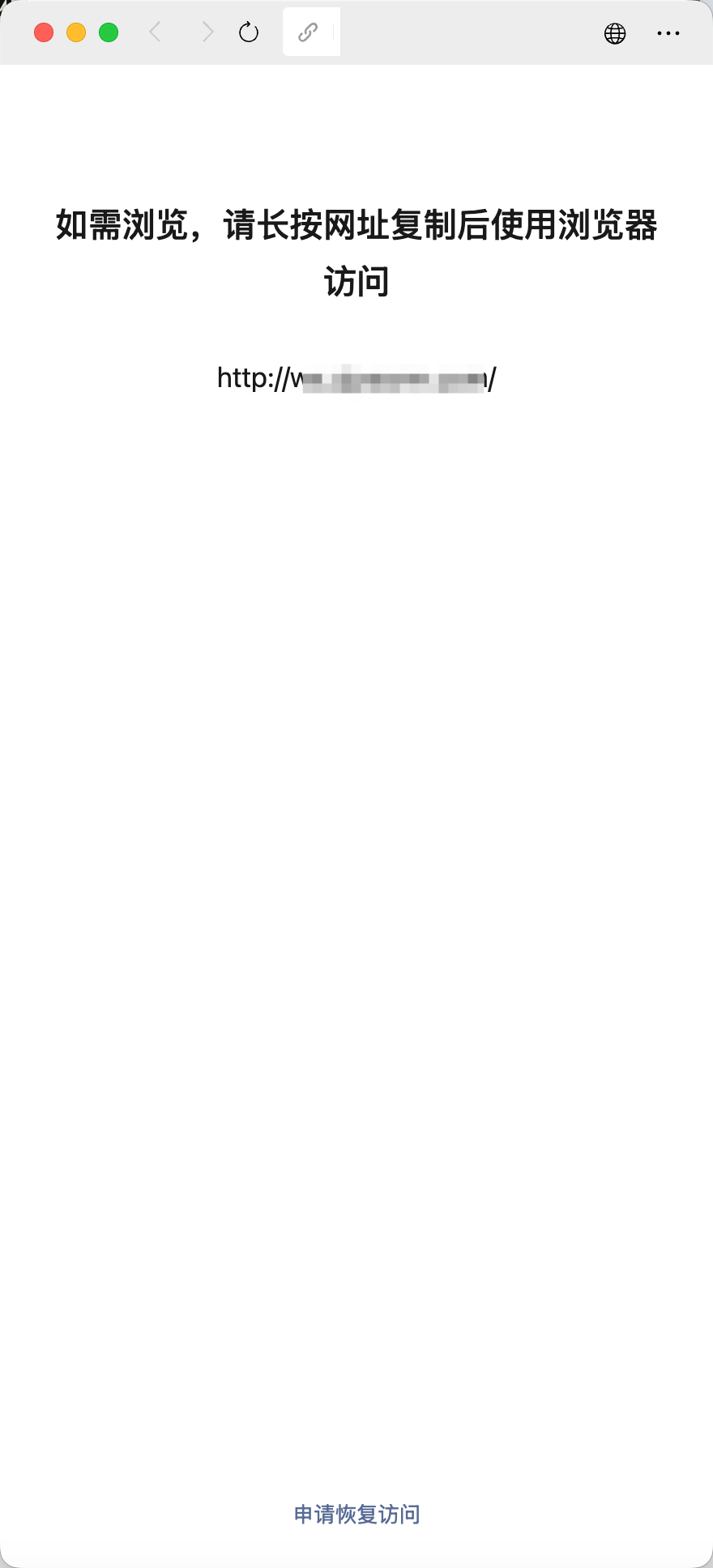 在微信中访问违规网站时会被拦截在以下页面,可以点击申请恢复访问进行申诉。