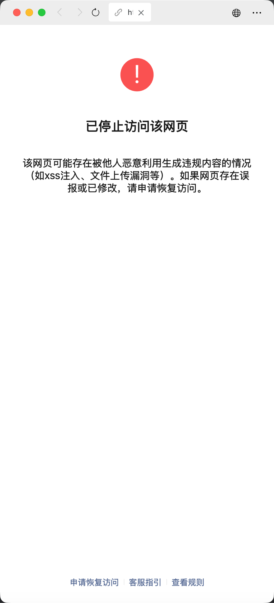 - 网站被恶意上传违规内容,提示被恶意利用。一般很少会遇到,如果遇到自己自查不了的可联系我方技术排查